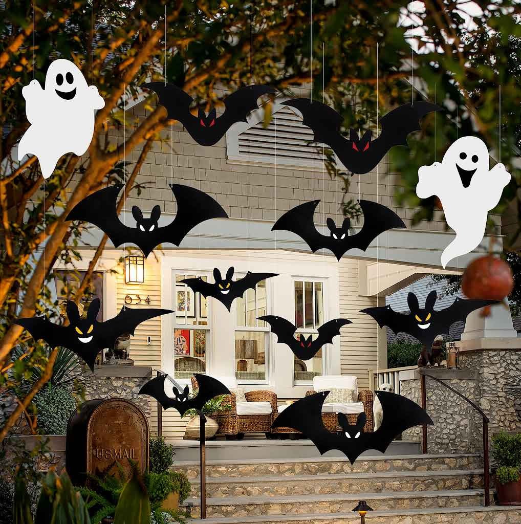 Hang bat cutouts from the ceiling or place them on walls. Ghosts can be made from white sheets or cheesecloth and suspended in trees or doorways. These elements bring a spooky atmosphere to any space.